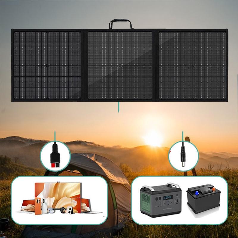 The 100W portable solar panel charger is designed for outdoor adventures, travel, and emergency power supply. Built with high-efficiency monocrystalline silicon solar cells, it delivers reliable solar energy while remaining lightweight and easy to transport. Thanks to its 3-fold design, the panel unfolds into a large charging surface and folds down compactly for storage. With multiple output interfaces including USB, USB-C, and DC, it supports charging of smartphones, tablets, cameras, drones, and portable power stations. The IP65 waterproof and dustproof construction ensures dependable performance in changing outdoor conditions.