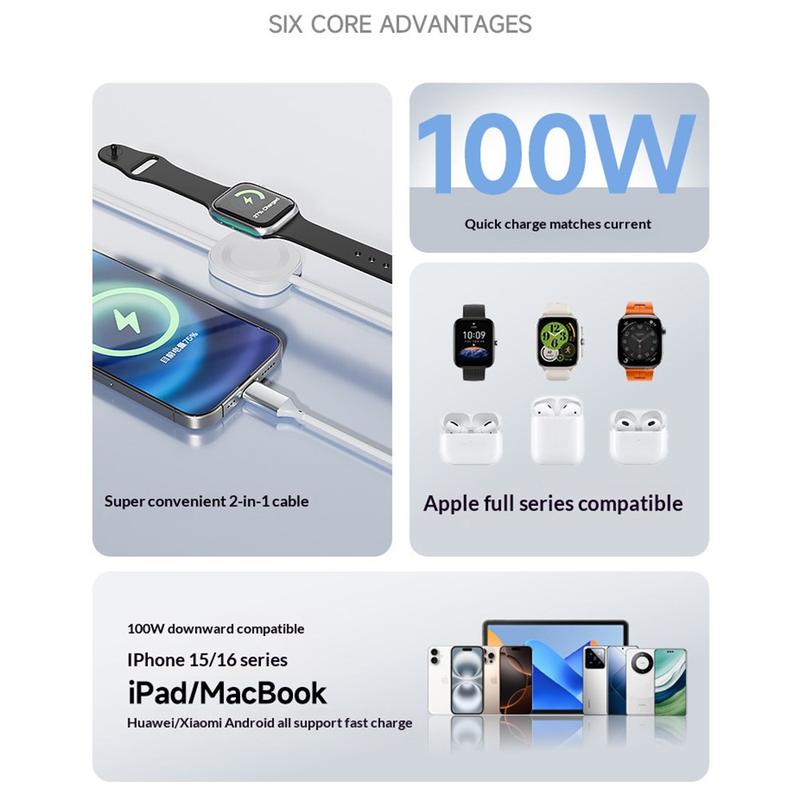 This 2-in-1 fast charging cable eliminates clutter by combining a powerful 100W PD connector with a magnetic Apple Watch charger. The strong magnet ensures perfect, worry-free alignment, while the copper core enhances efficiency and protects device batteries during fast charging. Its wide protocol compatibility makes it ideal for users with multiple devices—offering speed, convenience and long-term reliability in one compact accessory.