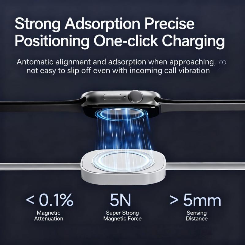 - Magnetic wireless charging pad for Apple Watch ensures secure alignment and stable charging