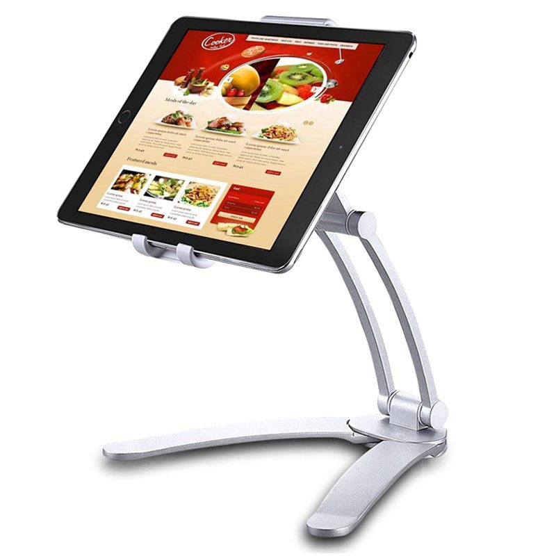 Watch your favourite YouTube channels, series, movies, or recipes while cooking, all without smudging your tablet. Simply place it on a desk, mount it on a wall, or position it in the kitchen. The included adhesive wall mount can also be affixed with two screws. This tablet holder boasts two legs that keep it firmly in place.