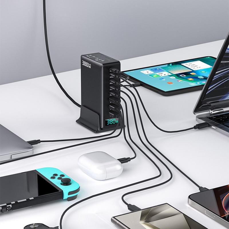 Power up your whole setup with a high-output 380W GaN desktop charging station built for modern homes and offices. With 8 ports (5x USB-C + 3x USB-A) and a digital power display, you can charge laptops, phones, tablets, headphones, power banks, and more at the same time—while keeping your desk clean and organized. GaN technology helps deliver strong performance in a compact form, and built-in safety protections help keep charging stable and reliable.