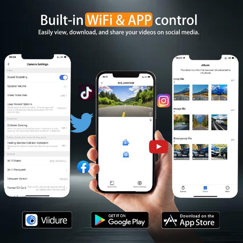 The 4K dual lens dash cam provides complete front and rear coverage in exceptional clarity, offering reliable protection during both driving and parking. The front camera records in true 4K resolution while the rear captures detailed 2.5K video, ensuring that every crucial detail is preserved. A 170° ultra-wide front viewing angle further reduces blind spots for safer, more confident driving.