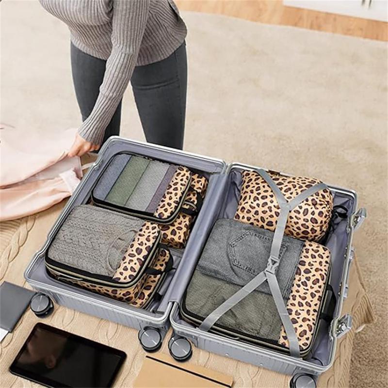 6-Piece Leopard Print Travel Organizer Set - Space-Saving Compression Bags for Clothes & Toiletries