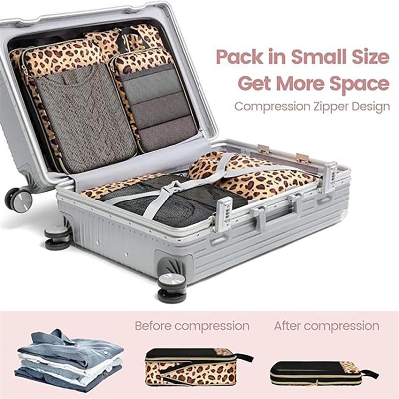 The 6-Piece leopard print travel organizer set combines fashion, function, and efficiency. With its eye-catching design, durable nylon construction, and smart compression system, it’s the ultimate organizer for stress-free travel.