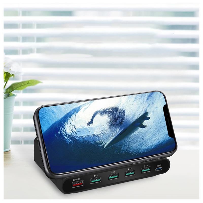 Upon being able to wirelessly charge your Qi-ready phone while holding it at a comfortable angle for video watching, this device can charge virtually any Android or iOS smartphone via one of the six USB ports.
