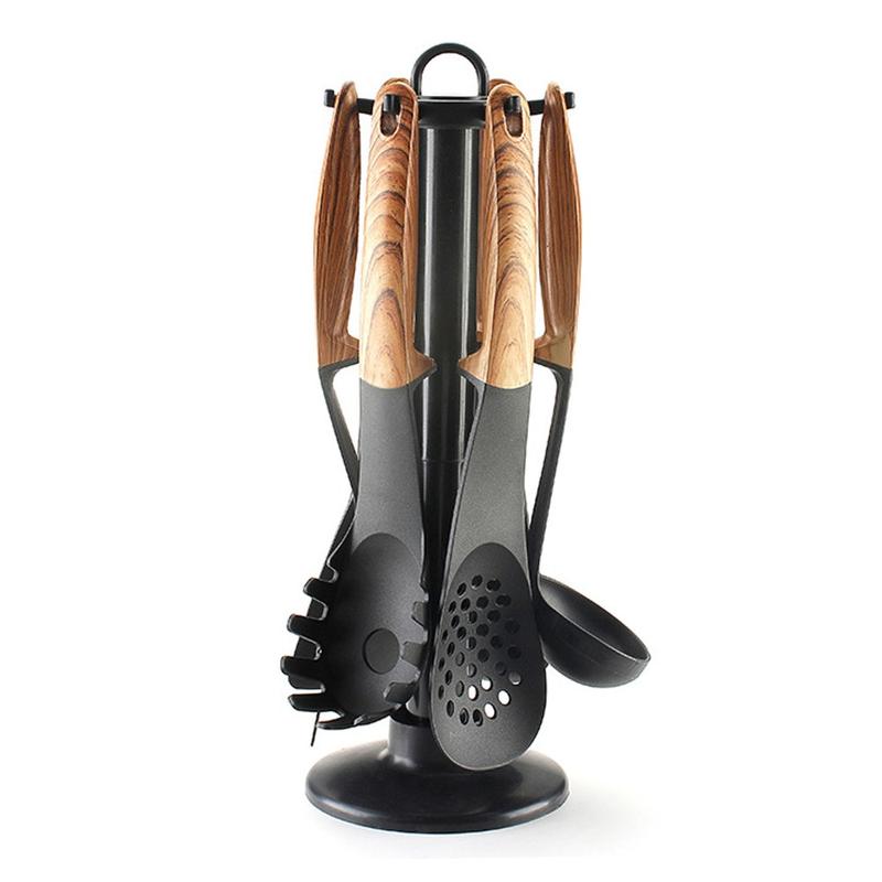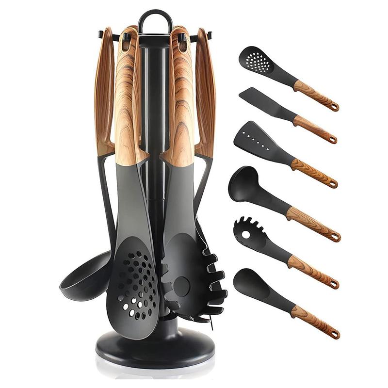 Upgrade your kitchen essentials with this 7-piece heat-resistant cooking tool collection, designed for everyday use and effortless cooking. With durable nylon heads, ergonomic wood-textured handles, and a convenient storage rack, this set delivers style, comfort, and practicality for every kitchen.