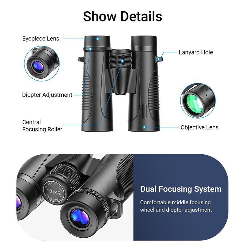 The APEXEL 10x42 HD binoculars deliver exceptional clarity, brightness and durability for outdoor exploration. Featuring a large 42 mm objective lens, BAK4 roof prism and fully multi-coated (FMC) optics, they offer sharp, high-contrast imaging with excellent light transmission—ideal for bird watching, wildlife observation, hiking, concerts and sporting events.