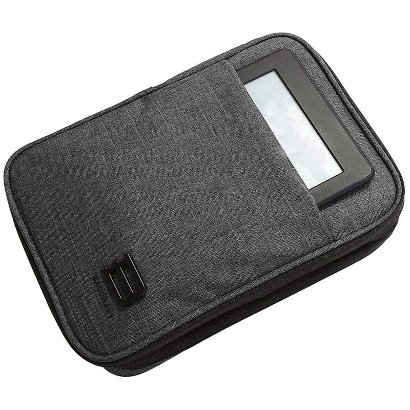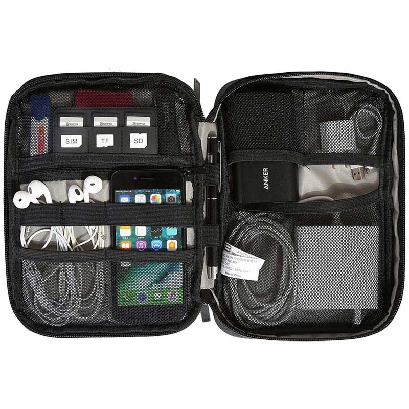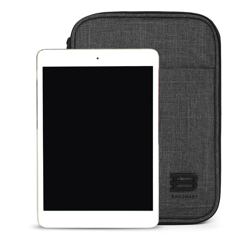 This Bagsmart Belmont organizer / carrying case is a perfect solution for family trips because it solves many problems such as tangling cables, etc. It features five elastic straps, five mesh pockets, an outer pocket, and a flexible hand strap. It is made of durable and water-resistant 300D polyester for additional security for your accessories.
