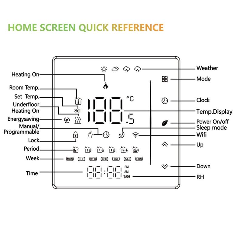 This thermostat features a stylish frameless front with a 3.0-inch LCD display and a 2.5D curved edge for a clean, modern appearance. Hidden capacitive touch buttons maintain the minimalist look while keeping operation simple and intuitive. The LED multi-colour screen makes it easy to check settings and monitor room conditions at a glance.