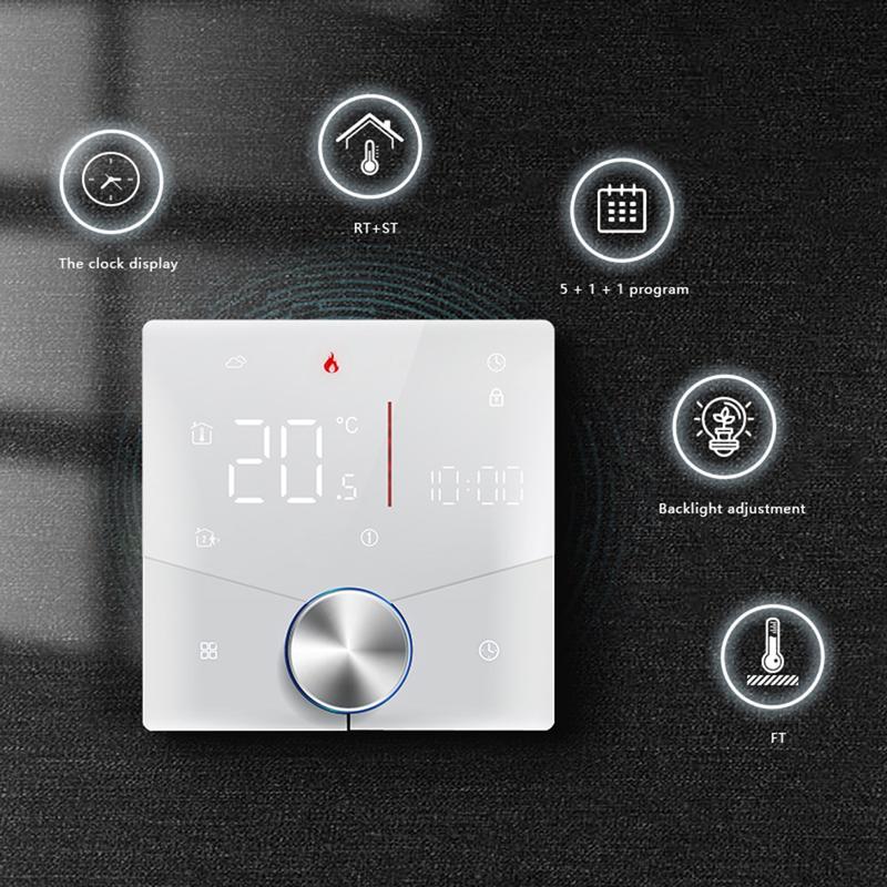 The thermostat supports a 5+1+1 weekly schedule with 6 programmable time periods per day, helping you match heating to your daily routine and reduce unnecessary energy use. Power-off protection automatically saves your settings during power cuts, so your configuration remains intact without the need for manual reset. This makes it a dependable option for both residential and commercial use.