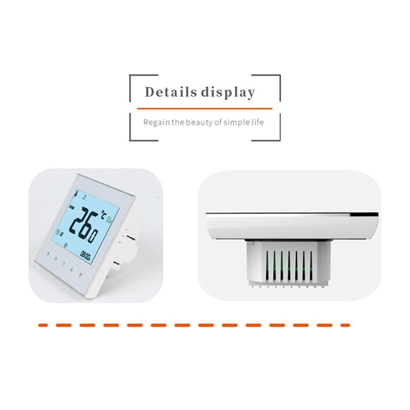 BHT-1000GB features a negative LCD display screen that remains easy to read in different lighting conditions. The capacitive touch keys provide smooth and intuitive control, making temperature adjustment quick and convenient. This combination of modern display technology and simple navigation makes the thermostat well suited for both private and professional environments.
