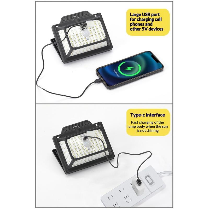 The CCP087 190 LED solar motion sensor light is an IP65 waterproof split outdoor lamp with bright five-sided illumination, PIR motion detection, solar panel charging, and Type-C backup charging. Ideal for gardens, garages, balconies, walkways, and camping, it offers flexible installation and practical energy-saving outdoor lighting.