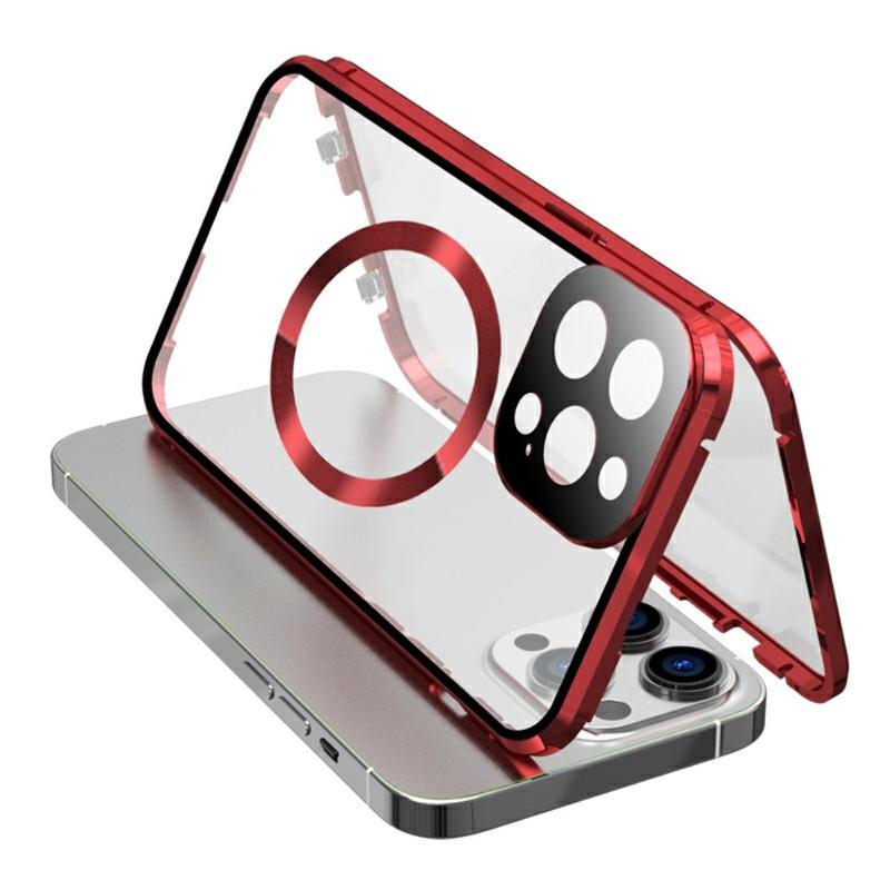 Compatible with MagSafe Case for iPhone 15 Pro Magnetic Metal Frame + Double-Sided Tempered Glass Phone Cover with Buckle Lock - Red