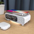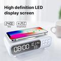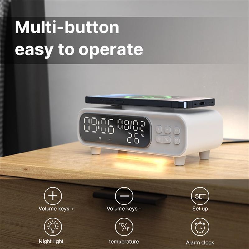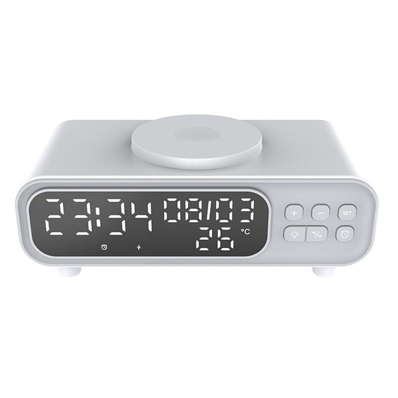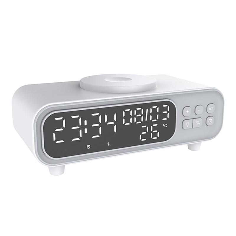 Simplify your bedside setup with the D15 multifunctional wireless charging station, a stylish all-in-one device that combines a 15W fast wireless charger, digital alarm clock, temperature display, calendar, and gentle night light in a single compact design. Perfect for bedrooms, offices, or nightstands, this 5-in-1 device keeps your space organized while providing practical daily functionality. The dual alarm setting lets you customize wake-up times, while the built-in temperature sensor shows real-time room conditions in °C or °F. The integrated 15W wireless charger supports fast charging for all Qi-enabled devices, including Apple, Samsung, and Huawei. Built-in safety features such as overcharge protection and heat dissipation ensure safe and efficient charging every time.