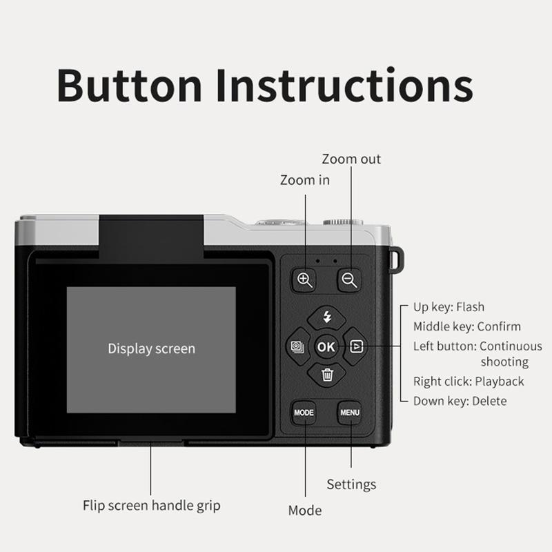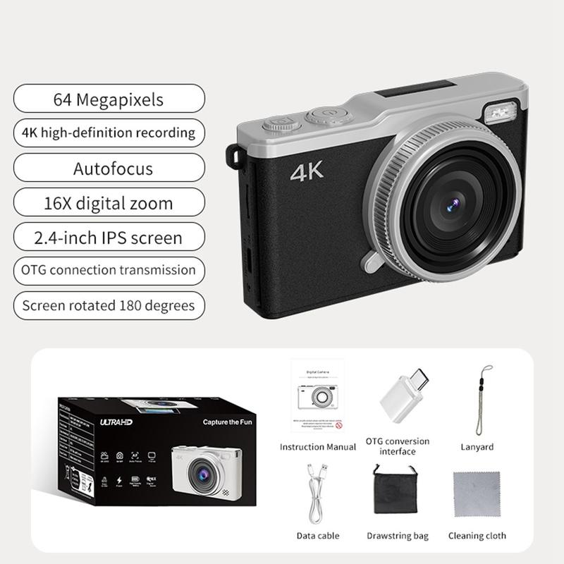 Capture every unforgettable moment in vibrant clarity with the D72 4K portable digital camera. Designed for creators, travelers, and photography enthusiasts, this compact yet powerful camera records in Ultra HD 4K resolution and offers a 16X digital zoom for stunning detail from any distance. The 2.4-inch 180° flip screen lets you frame perfect selfies and creative angles with ease, while the autofocus system ensures sharp, lifelike images every time. With multiple shooting modes, including time-lapse, burst, and interval photography, the D72 gives you creative freedom to tell your story your way. Its retro-inspired design combines modern performance with timeless style, and the included 32GB memory card lets you start shooting right out of the box.
