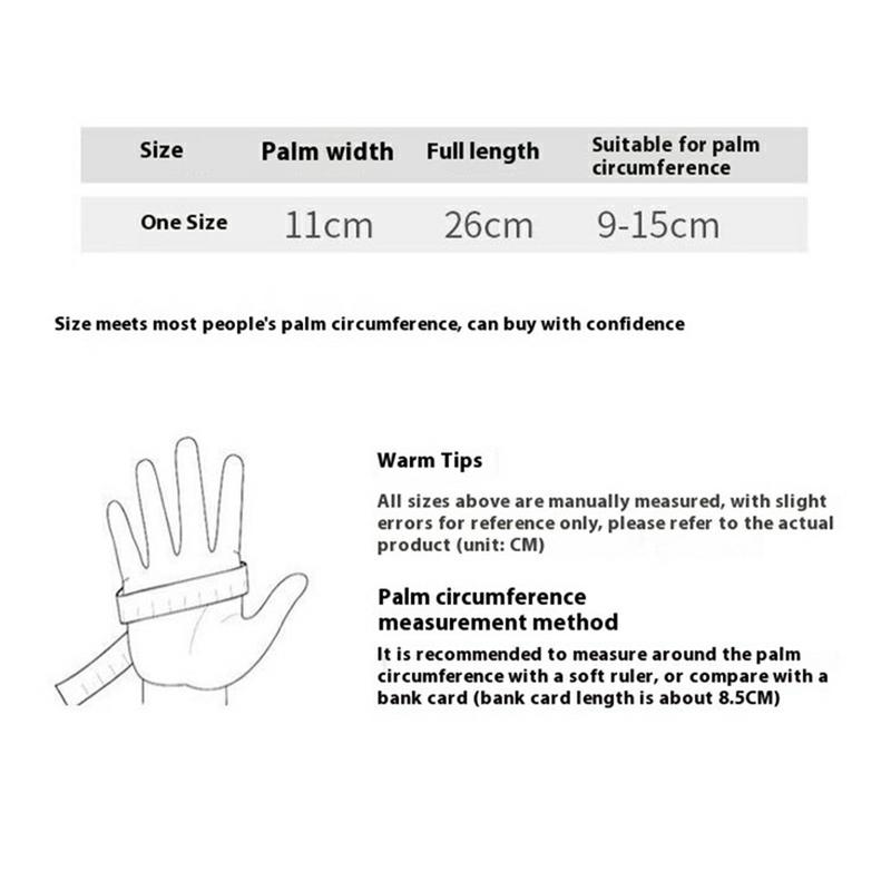 - One-Size-Fits-Most – Palm width: 11 cm | Length: 26 cm | Fits palm circumference: 9–15 cm.