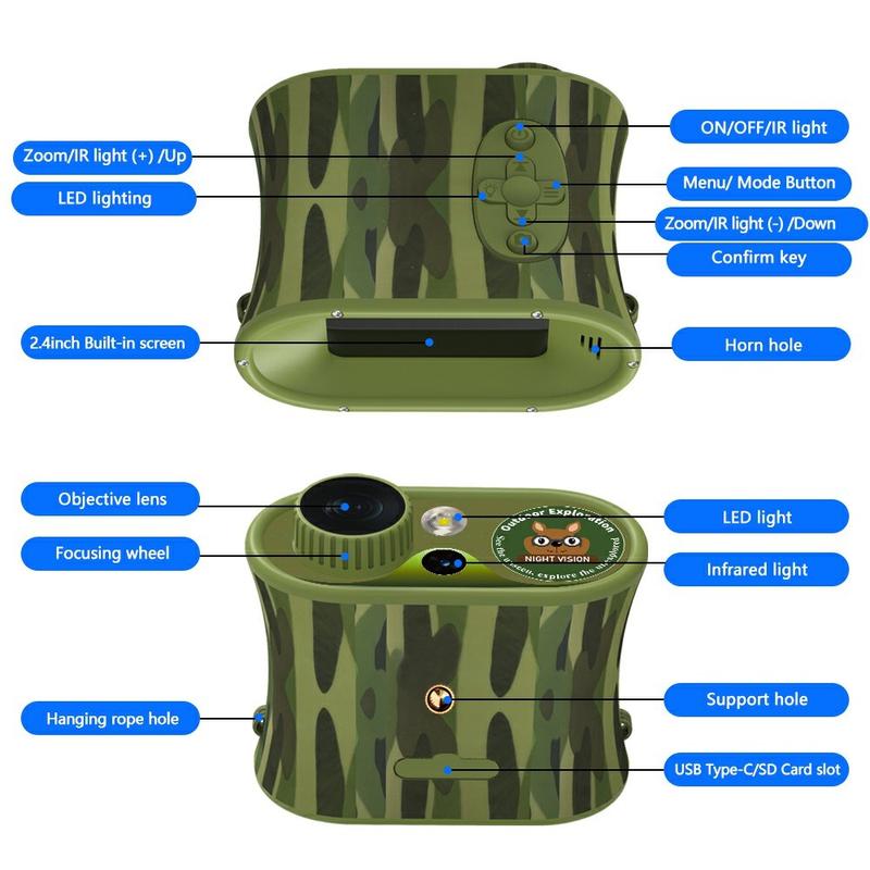 Explore the outdoors day or night with the DT15 digital telescope camera binoculars. Designed for birdwatching, wildlife observation, camping, and night adventures, it captures sharp photos up to 48MP and records video in 2.5K UHD. A powerful 3W 850 nm infrared light with 7-level adjustment helps you see clearly in darkness at distances up to 150-200 m (as stated), while the bright 2.4-inch IPS screen makes viewing and playback easy without squinting through a tiny viewfinder. With 4x optical zoom plus 8x digital zoom, a built-in white LED flashlight, tripod mounting support, and a rechargeable 2200mAh battery, it’s a versatile tool for outdoor trips and family use.