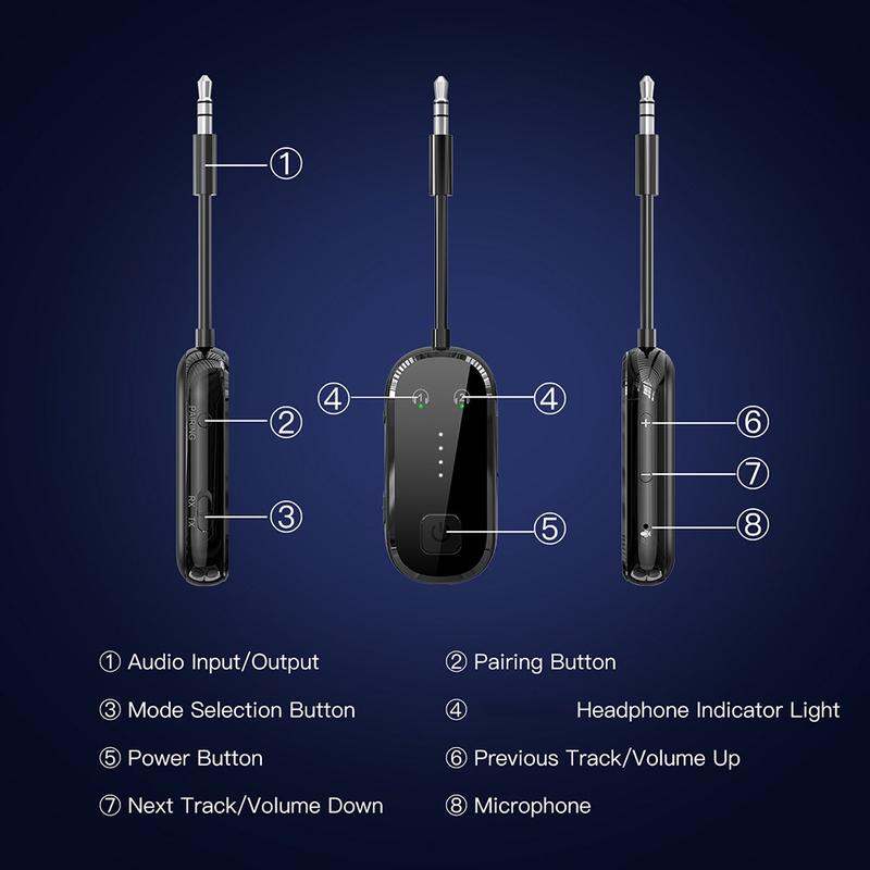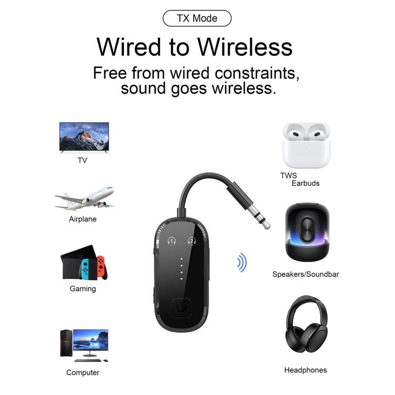 - Use TX mode to connect a TV, PC, or other wired audio source to Bluetooth headphones for wireless listening
