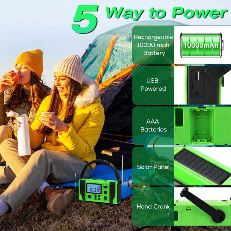 You’ll never be left without power thanks to four versatile charging methods: Solar panel (0.1 W), Hand-crank generator, Type-C input, AAA battery backup (AAA batteries not included). This ensures the radio stays powered during emergencies, camping trips, storms, and remote adventures.