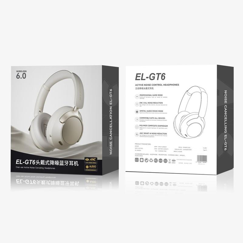 The EL-GT6 ANC noise cancelling wireless headphones delivers immersive audio and long-lasting comfort for gamers, music lovers, and professionals alike. Featuring advanced ANC 3.0 technology with adaptive noise reduction, it blocks out distractions and enhances your listening experience. Equipped with 40mm dynamic drivers and micro-crystal composite diaphragms, it produces deep bass, clear mids, and crisp highs for HiFi sound quality. With Bluetooth 6.0 connectivity, low latency, and up to 120 hours of playtime, this over-ear headset combines performance, comfort, and endurance in one premium package.