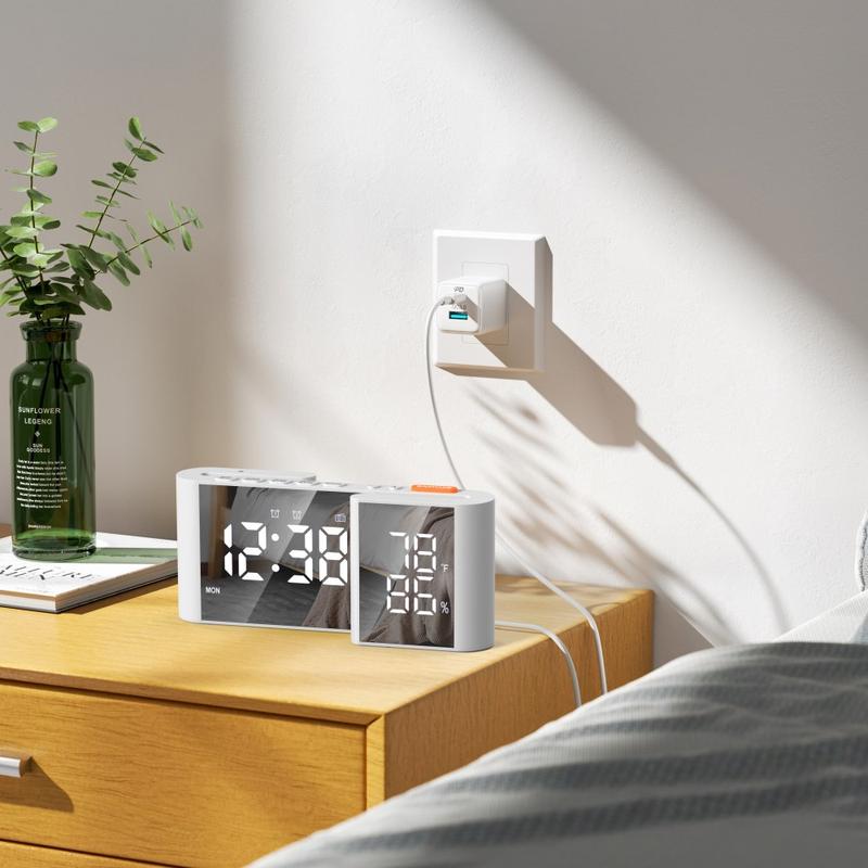 The 6-inch dual LED display features two connected panels for clear, easy-to-read information. The mirrored front surface adds a premium look, while the curved S-shaped body fits perfectly in any modern bedroom, office, or living space.