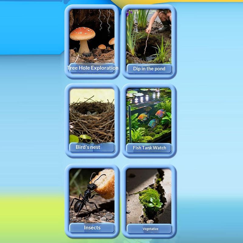 - Forest and garden adventures: look inside tree bark gaps, plant roots, and small hollows