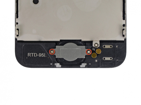 Two 1.3 mm Phillips screws securing the home button bracket to the display assembly need to be removed.