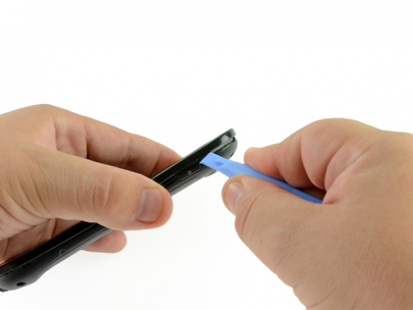 Insert the plastic opening tool to the right of the power button.