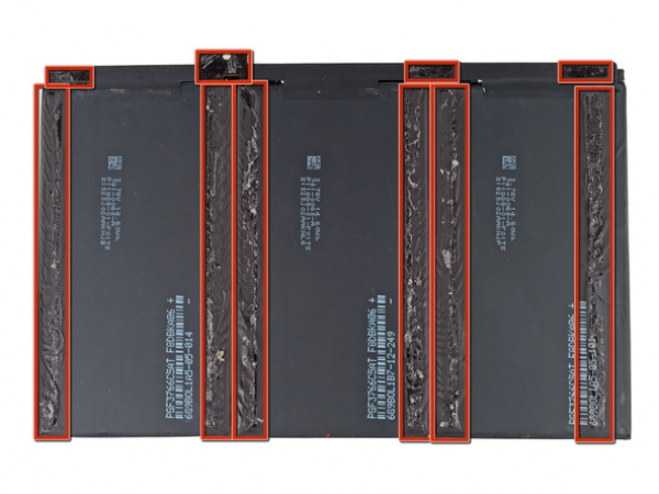• The battery is glued to the aluminum frame with very strong adhesive.
