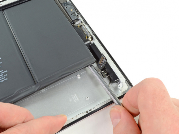 • Push the flat end of a metal spudger under the battery. Do this near the bottom of the iPad.