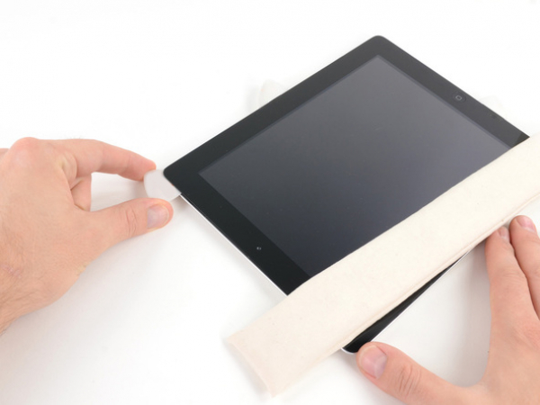 Put the iOpener flat on the right edge of your iPad and smooth it out. This way you'll be sure that there's good contact between the iPad and the iOpener.
