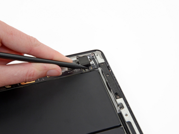 Move the microphone ribbon cable to the side with the flat edge of the spudger.