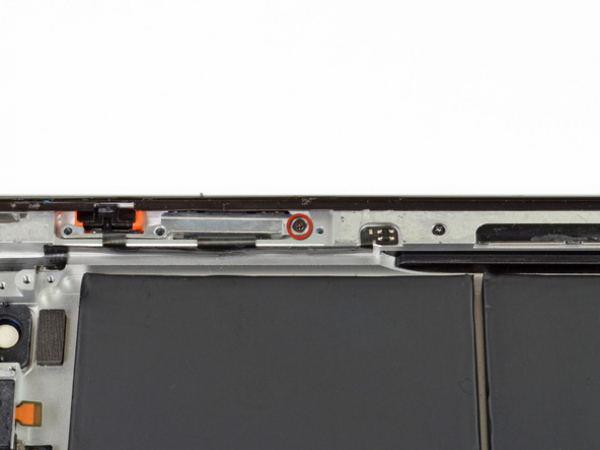 • There are five screws securing the power and volume button cable to the aluminum frame: