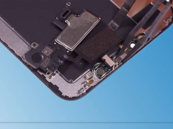 -Pin the light sensor to it's notch in the display. -Again, watch out for the frigle flex cables. -Flip over the speaker. - Secure the speaker with the screws.