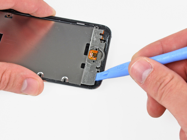 • Gently pry (but not remove) the back-facing camera away from the back case, using the edge of the iPod opening tool.