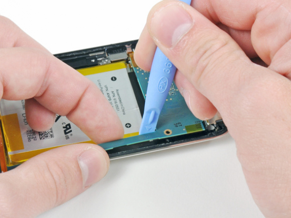 • Gently lift the edge of the headphone jack nearest the battery out of its recess by using our opening tool.