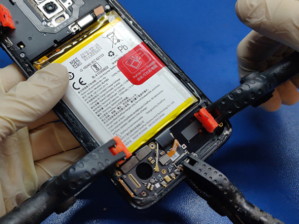 Phone goes screen-down on the hot plate for about 2-3 minutes at 100°C.