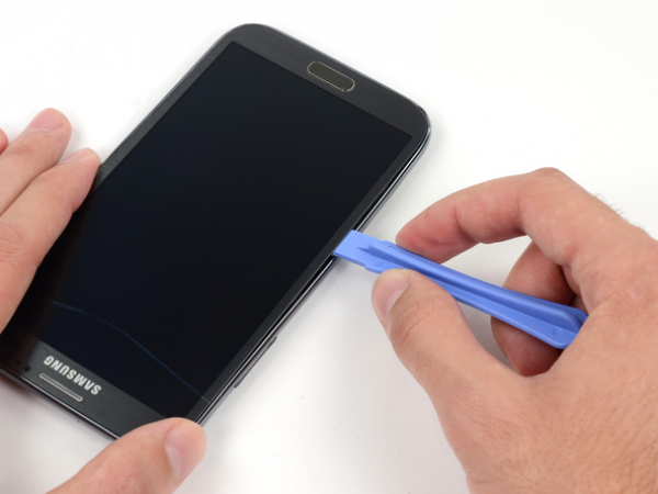 Wedge in the plastic opening tool between the midframe and the front panel assembly (the side of the phone).