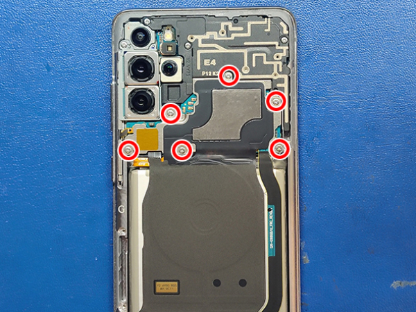 • Remove the six 4.0mm Phillips screws securing the Qi charging coil.