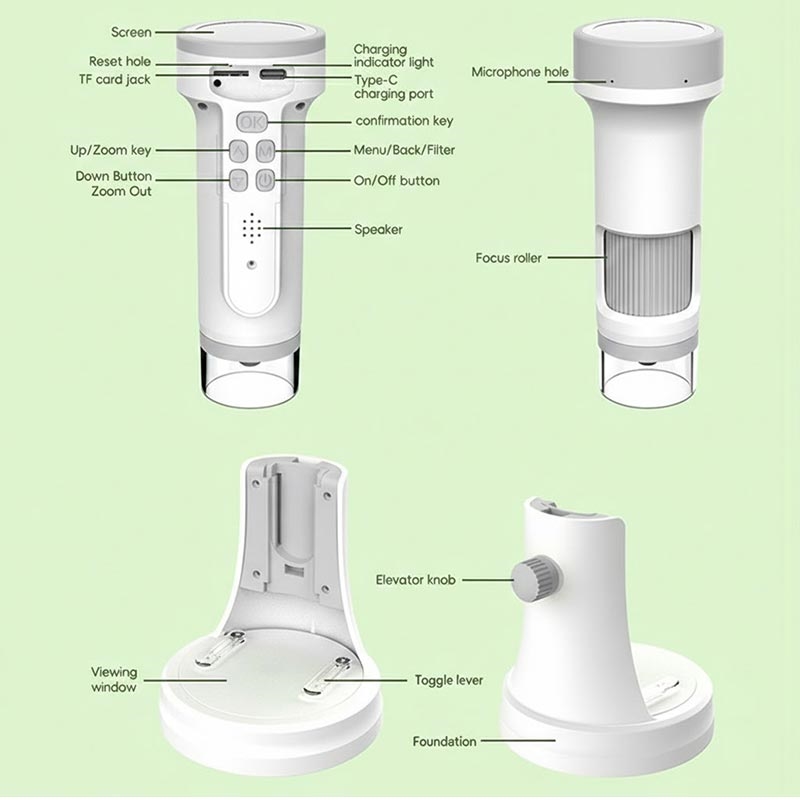 The F9 digital microscope is a compact and educational device designed to introduce children and beginners to the microscopic world in a fun and accessible way. With dual handheld and desktop use, a clear round IPS display, and high-resolution photo and video recording, it allows young explorers to observe, capture, and learn wherever curiosity strikes—at home, in school, or outdoors.