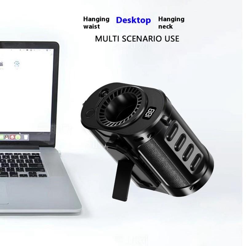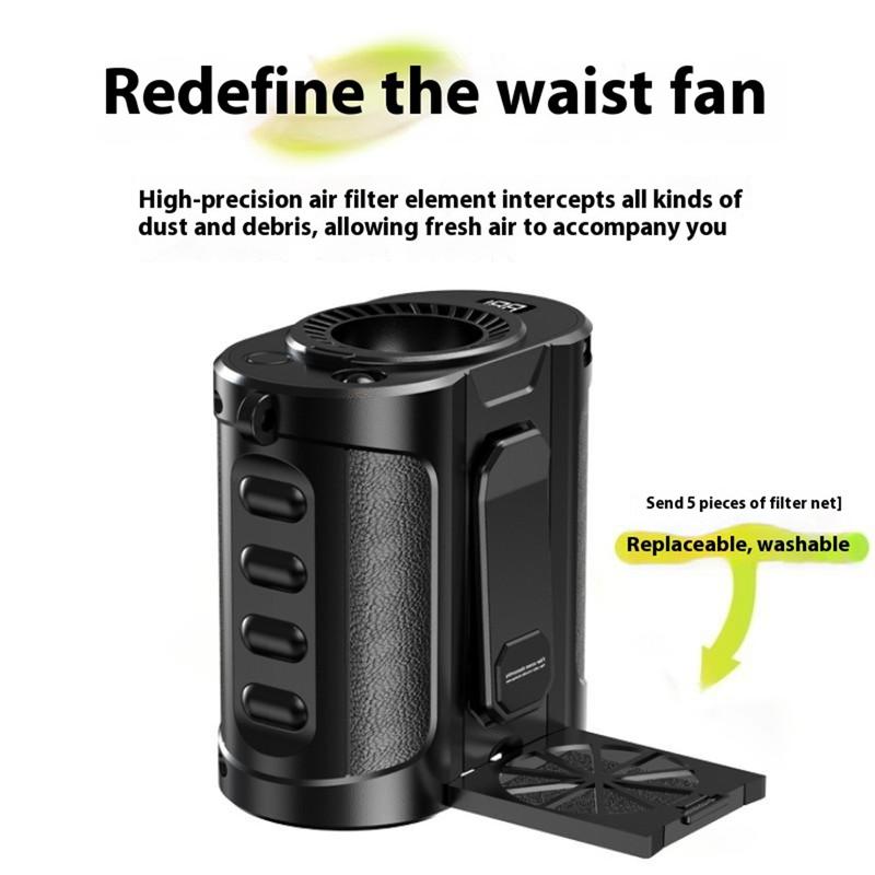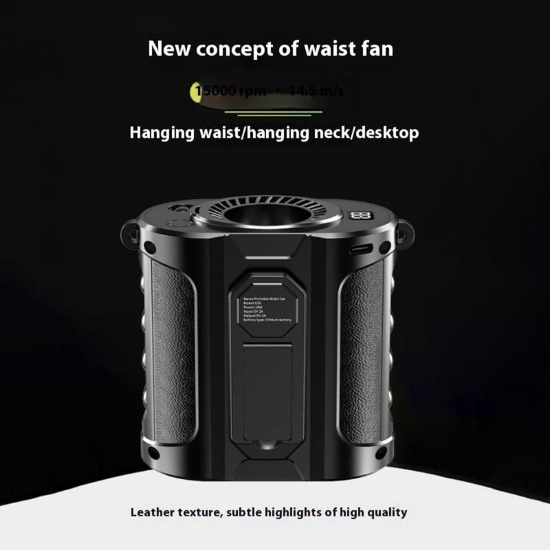 - Waist-mounted fan for hands-free cooling, also supports desktop use with stand