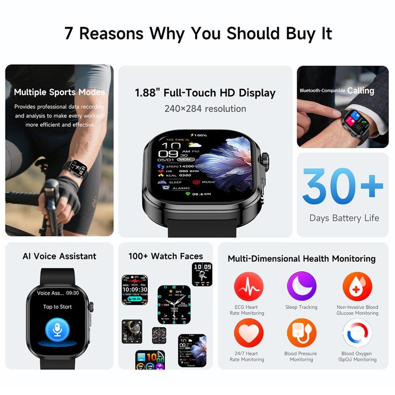 • GE52 Smart Watch with 1.88" HD Screen - ECG Heart Health Monitor, Bluetooth Calling & Fitness Tracker