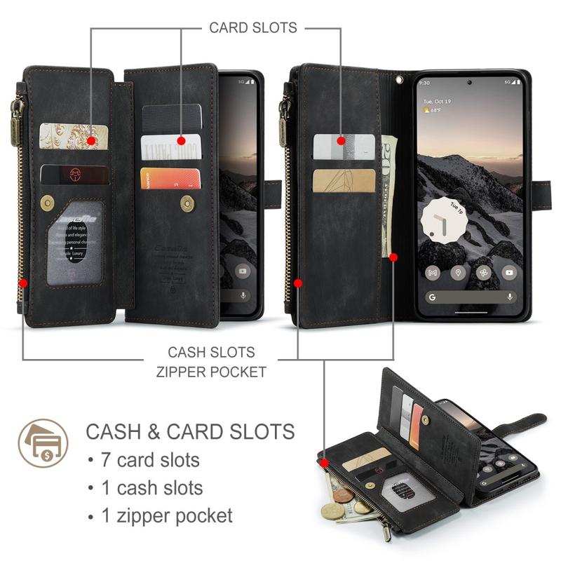 The Caseme C30 multifunctional wallet case for Google Pixel 10a brings exceptional all-around protection and an exclusive, refined design. This elegant case is made of premium polyurethane, reinforced with a shock-resistant TPU inner cover that snuggles your Google Pixel 10a perfectly. Meanwhile, the Caseme C30 wallet case is enhanced with numerous card slots, one large money compartment inside, and one outside zipper pocket, all protected by a secure magnetic closure.