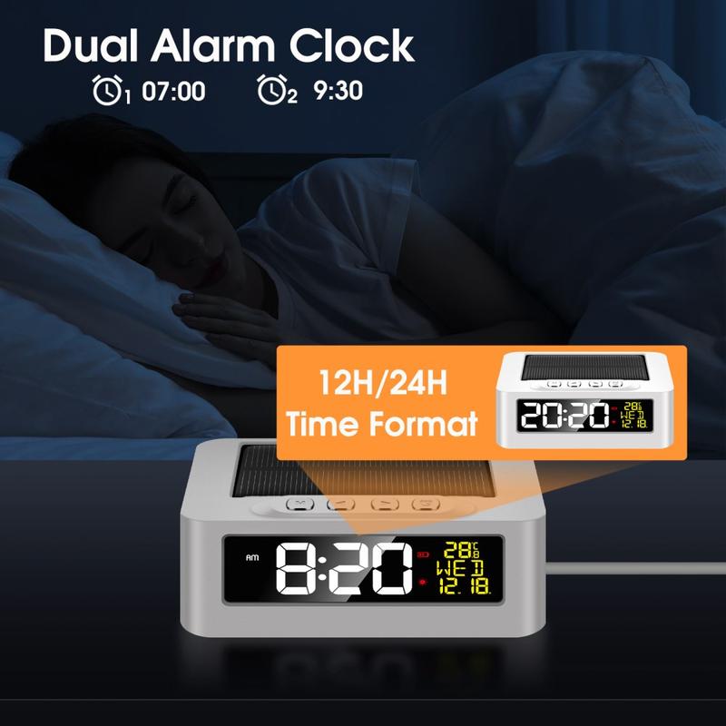The GS-301 solar powered LED digital alarm clock is a compact, travel-friendly clock that shows time, date, weekday, and temperature on a clear high-definition LED screen. It supports dual power (solar charging plus USB Type-C charging) for dependable use in different environments, from the car to the bedside table or campsite. With dual alarms, 12/24-hour format switching, a 5-minute snooze, and a built-in fatigue driving reminder, it’s a smart choice for everyday routines and long journeys.
