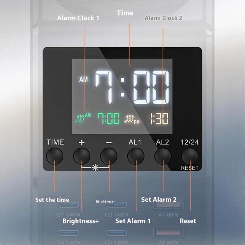 - 6-in-1 Multi-Functional Design - Combines alarm clock, wireless charger, and multi-port power station.
