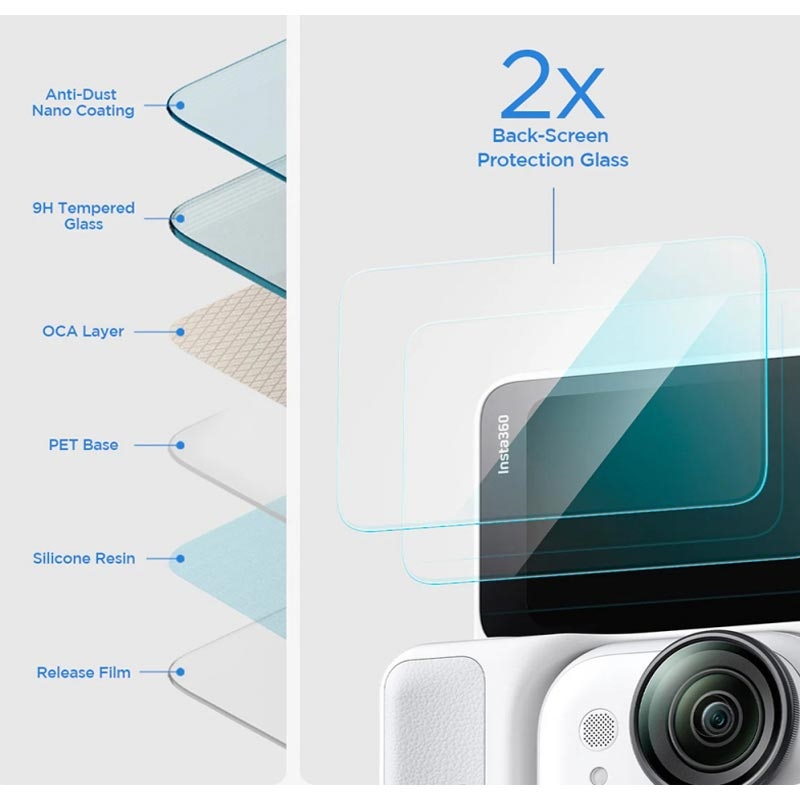 The 0.3mm thick tempered glass boasts the industry-standard 9H hardness, so it's resistant to scratches by keys, coins, and other items in your purse or pockets. Upon that, the oleophobic surface and smooth 2.5D edges ensure easy maintenance and comfort when holding your Insta360 Go Ultra.