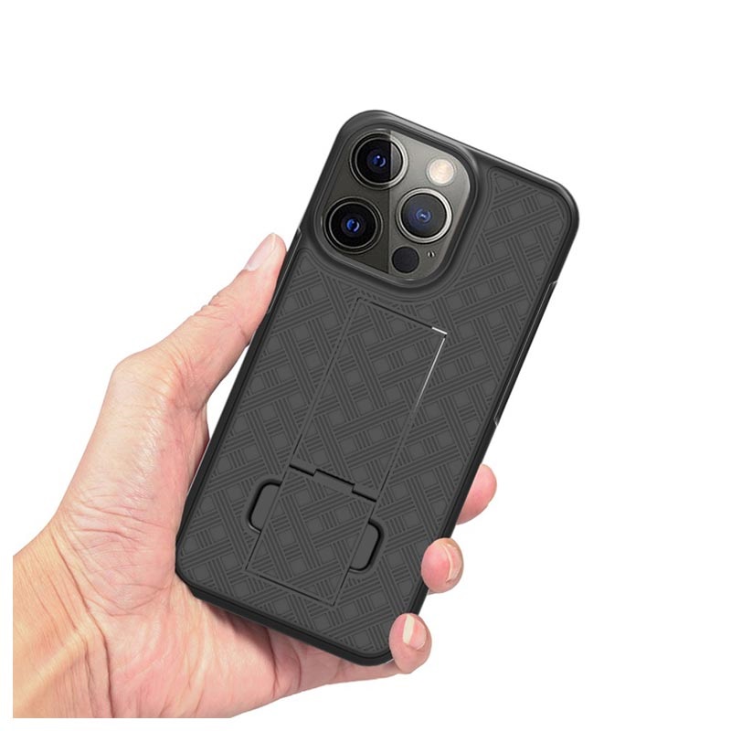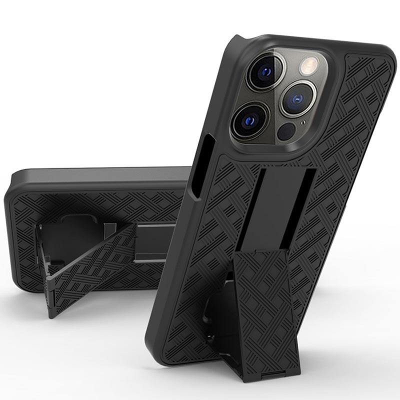 This case stands out with a unique belt design and stylish pattern and gives your iPhone 13 Pro extra protection. Combining plastic and TPU, the hybrid case with a belt clip protects your iPhone 13 Pro from daily wear, drops, scratches, and dust. With the kickstand feature, it is ready for media viewing.