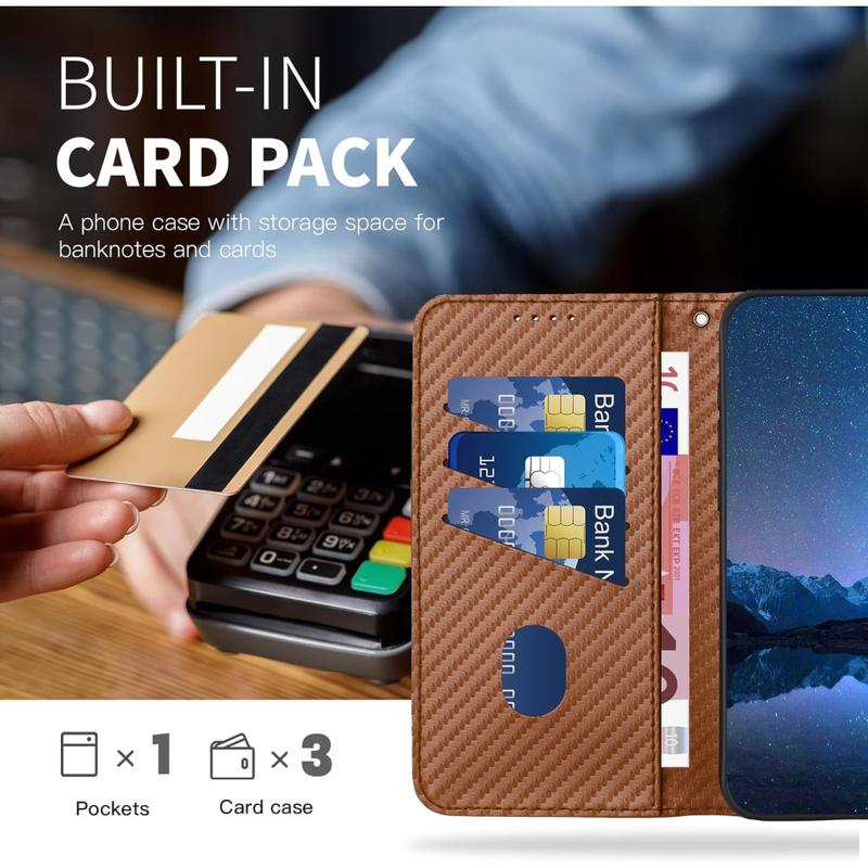 This wallet case offers elegant design, reliable protection, and smart usability. The textured carbon fiber finish adds a modern, professional look, while the inner TPU layer absorbs shocks from accidental drops. With hands-free functionality and a detachable strap, it’s built for comfort and versatility.