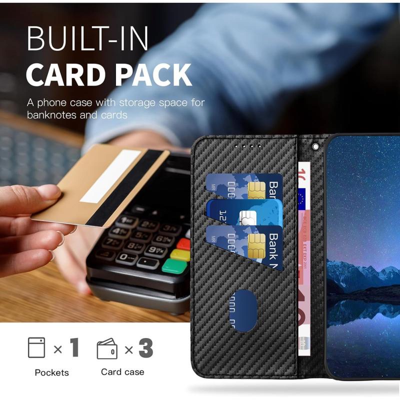 This wallet case offers elegant design, reliable protection, and smart usability. The textured carbon fiber finish adds a modern, professional look, while the inner TPU layer absorbs shocks from accidental drops. With hands-free functionality and a detachable strap, it’s built for comfort and versatility.