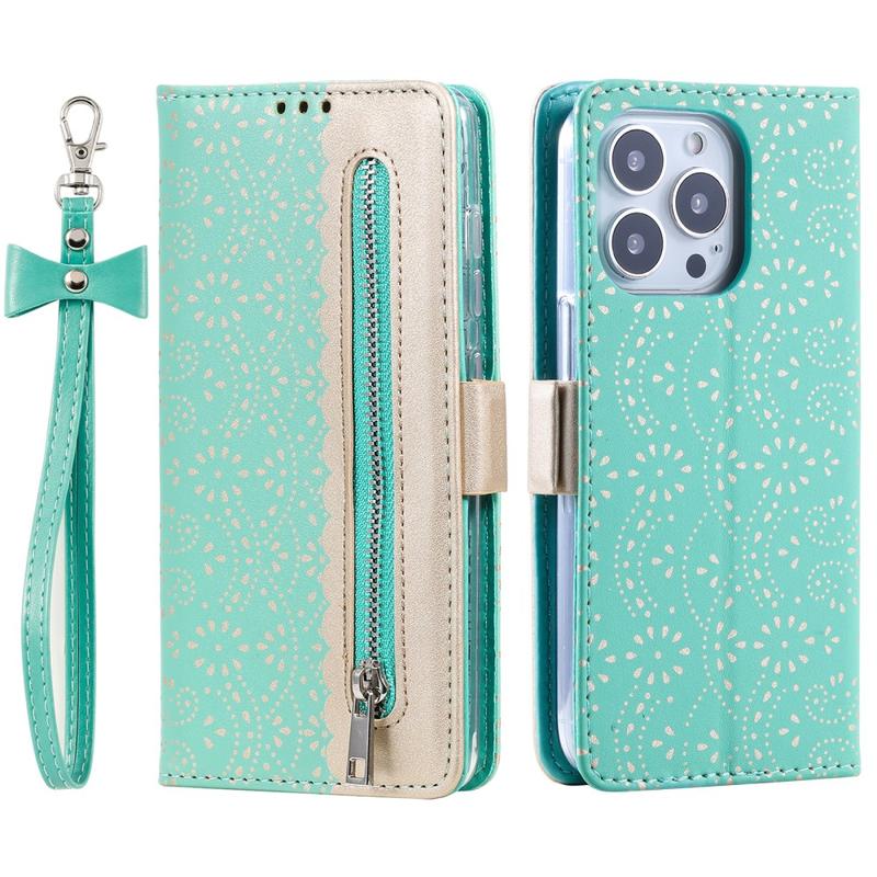 This incredibly stylish wallet case with lace pattern protects your iPhone 16 Pro from damage, and front zipper pocket lets you store paper money and coins.